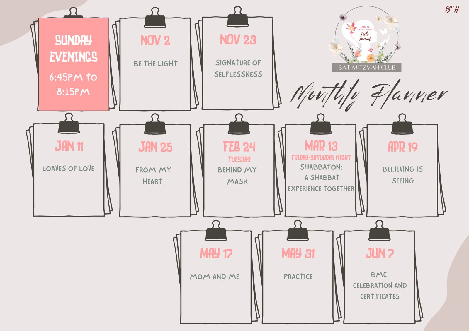 Through interactive lessons, high-quality projects, and meaningful discussion, club members will cultivate a knowledge, understanding, and pride in their Bat Mitzvah journeys.