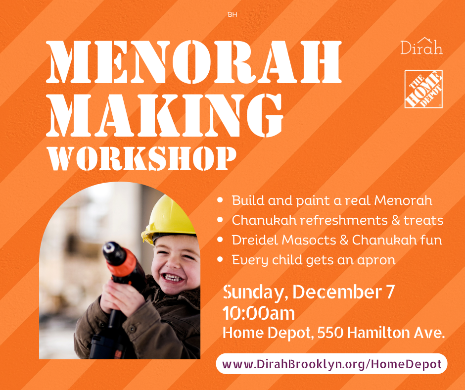 Kids will receive their own Home Depot apron and a wooden menorah kit to build and paint, bringing their creativity to life. Families can enjoy Chanukah-themed refreshments, hang out with Dreidel mascots as we craft, celebrate, and get into the Chankuah spirit together. A perfect hands-on experience for children of all ages!
